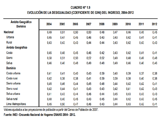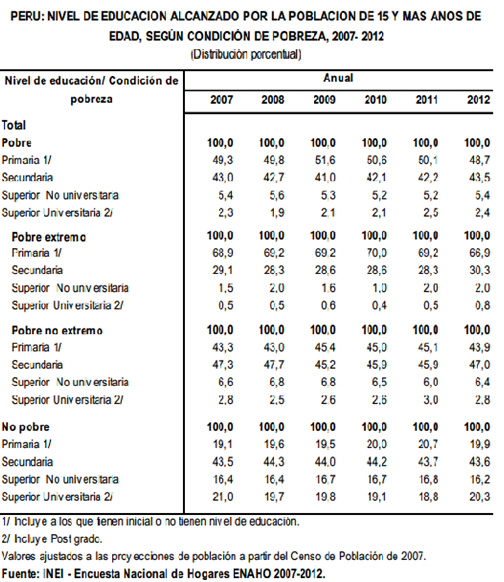 Al igual que en muchos otros países no industrializados, la pobreza y la desigualdad es siempre un tema de agenda del gobierno y de interés nacional. En nuestro país aún 7.8 millones de peruanos se encuentran en la pobreza. En el ámbito rural pasó de 56.1% en el 2011 a 53% el 2012, mientras en el área urbana se redujo de 18% a 16.6%, según el Instituto Nacional de Estadística.Esta reducción de la pobreza se debe al crecimiento sostenido de la economía, que llegó a las regiones donde se concentran los niveles más altos de pobreza y donde se han focalizado los programas sociales. La pobreza extrema registró una disminución de 0.3 puntos porcentuales, es decir, 69,000 personas dejaron de ser pobres extremos. El estudio también indica que el año pasado 1.8 millones de personas se encontraban en situación de pobreza extrema, lo que en términos porcentuales representa el 6% de la población.