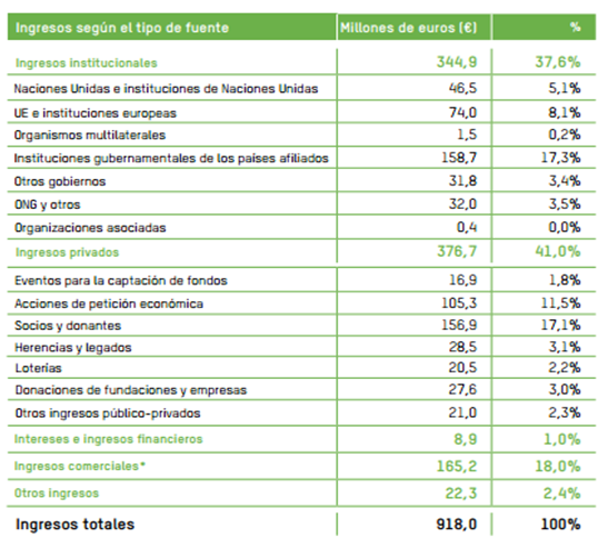 Nota: Los ingresos comerciales se refiere a instituciones gubernamentales en los países afiliados, socios y donantes (ingresos privados), acciones de peticiones económicas, UE e instituciones europeas, Naciones Unidad e instituciones de Naciones Unidas (Ingresos Institucionales) .