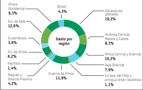 En el informe del 2011- 2012 la organización Oxfam International tuvo los siguientes gastos, distribuidos en distintas regiones y dotaciones globales. Como se observa la región del Sur de Asia obtuvo el mayor porcentaje de gastos con 12.6% puesto que se invirtió 80,6 millones de Euros de un total de 638,0 millones de Euros, caso contrario sucede con Europa del Este y antigua Unión Soviética que solo obtuvo 1.1% con una inversión de 6,9 millones de Euros. En el caso de las Dotaciones globales obtuvo un 19,2% con una inversión de 122,5 millones de dólares donde incluyen gastos de panillas y equipos.